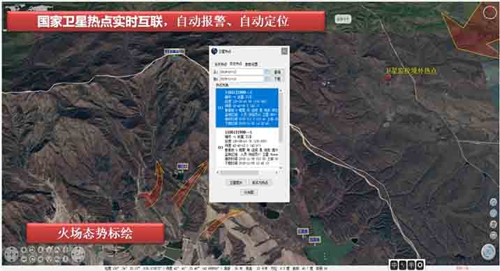 自(zì)動接收國(guó)家森防指衛星監測預警信息中心、省氣研所、中科院衛星熱點,自(zì)動報警、自(zì)動标注地(dì)圖、自(zì)動顯示。