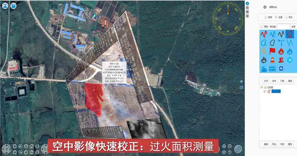 無人機/有人機在空中拍攝的(de)現場圖像快速校正疊加到地(dì)理(lǐ)信息上,實現火場現場的(de)實況顯示,并實現火場、火線、火頭、火面等火場的(de)測量和(hé)态勢生成。