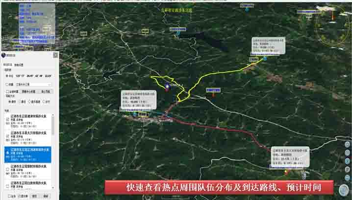 自(zì)動計算、統計熱點附近的(de)隊伍,取水點、道(dào)路山形、林業資源等,自(zì)動計算前行路線,自(zì)動預計到達時間,指揮中心彙聚多方信息在高(gāo)清三維GIS圖上,供決策使用。